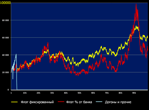 Эти основные стратегии размещения ставок проверены нами через моделирование 10000 исходов прогнозов и наглядно изображены на графике ниже.